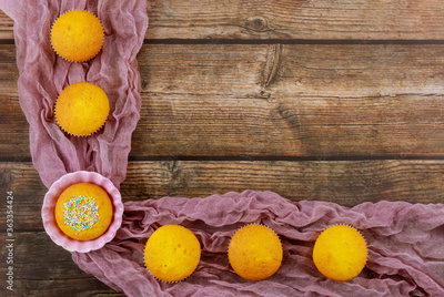 Vanilla muffin cakes on wooden background.