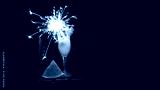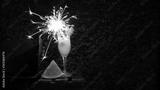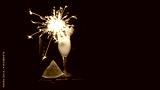 Orange cocktail in a stemmed glass decorated with a heart-shaped fruit and a firework candle, accompanied by a piece of watermelon