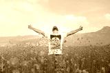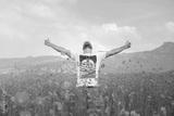 A boy facing the camera with his hands outstretched in a field of pink flowers, at the bottom of a high mountain. Cry of freedom, exaltation.
