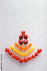 Creative photo design of various colorful cherry tomatoes on white background. Top view of colorful cherry tomatoes, flat lay.