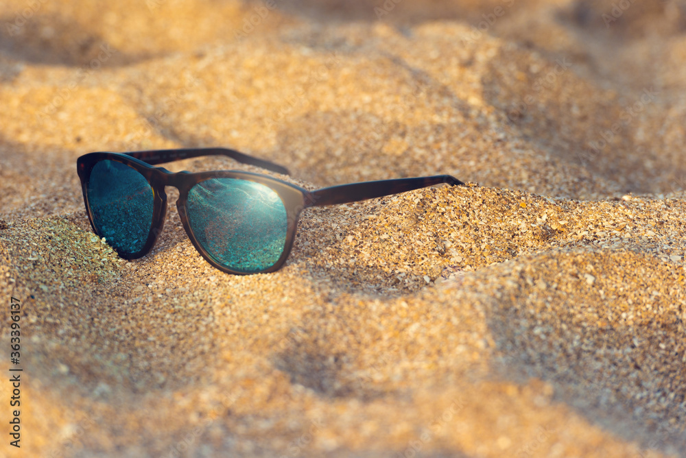 Mirrored sunglasses on beach sand with sundown and couple reflection. Summer sunglasses on sand in sunset beach