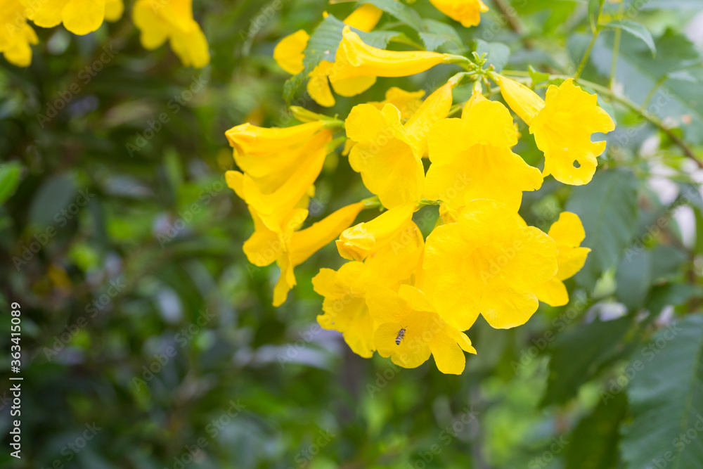 Yellow Elder, Gold Yellow color trumpet flower, Ellow Elder, Trumpet bush, Tecoma stans in nature garden.