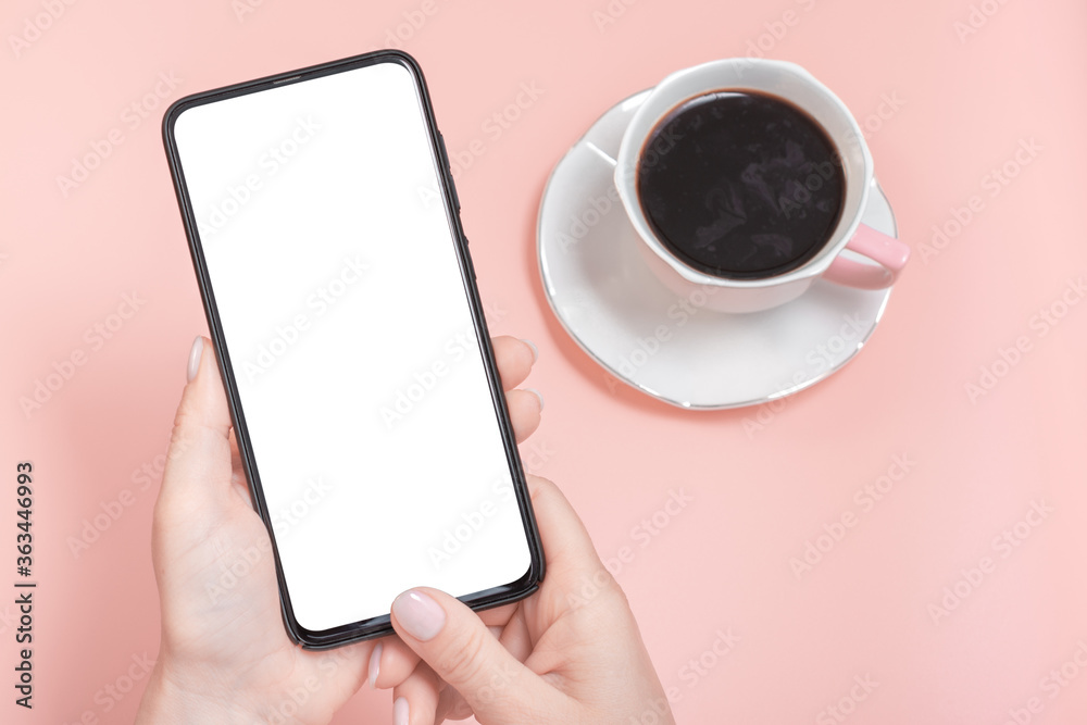 Mockup cellphone. Women's hands hold a mobile phone with a blank screen on a pink background. a Cup of coffee on the pink table