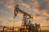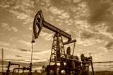Petroleum concept. Oil pump rig. Oil and gas production. Oilfield site. Pump Jack are running. Drilling derricks for fossil fuels output and crude oil production. Global crisis. War on oil prices.