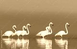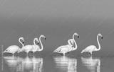 Wild african birds. Group birds of pink african flamingos walking around the blue lagoon on a sunny day.