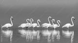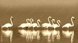 Wild african birds. Group birds of pink african flamingos walking around the blue lagoon on a sunny day.