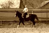 Girl riding a horse gallops in a paddock on a ranch