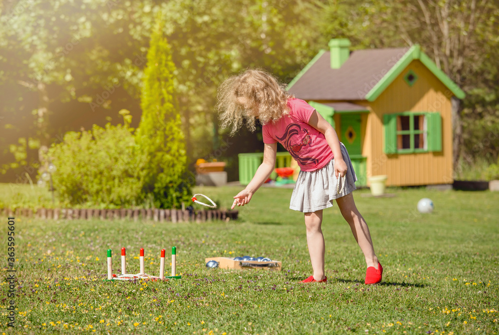 Cute 6 year old child girl play rope peg throwing game in home garden outdoors on sunny summer day. Leisure activity concept.