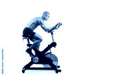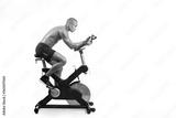 man on bicycle simulator doing exercises isolated on white background