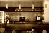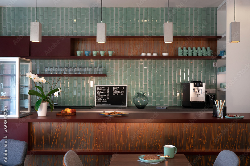 Modern Retro Cafe Interior with eye catching green tile wall background, close, German Pricing Table on the counter