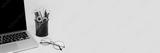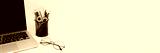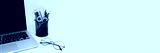 Laptop, glasses, metal bucket with stationery on a beige background. Banner with place your design.