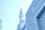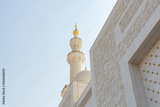 Abu Dhabi, UAE - October 5, 2019 - Beautiful mosque of the tower of the white marble minaret on a background of blue sky. United Arab Emirates. Copy space