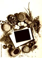 Order food online concept. Tablet computer with blank screen and notepad on a cutting board with ingredients for cooking vegan food top view.