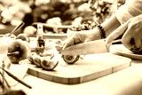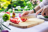 Woman cutting red tomato with kitchen knife on wooden board. Preparing food outdoors