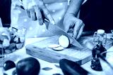 Woman cutting red onion with kitchen knife on wooden board