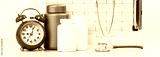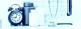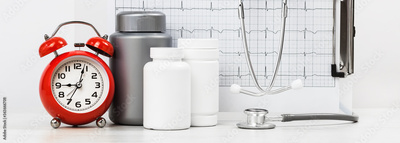 Medicine and pharmacy background. Pills and stethoscope against ECG with printed heart rate. Mockup tablets vials. Medical concept web banner. Red alarm clock