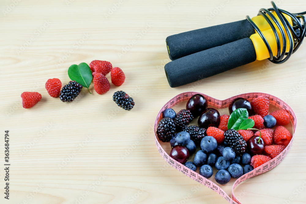 Assortment of berries, dosing tape and jump rope on the wooden background. Symbols of healthy sport life and fruit balanced eating.