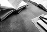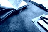 workspace with books notebook pens on the desk. Close-up with copy space for text.