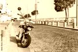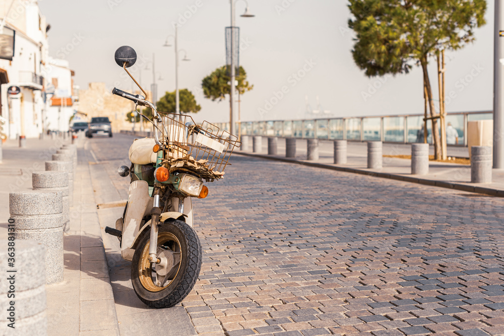 Retro motorbike, moped on the narrow street on the promenade of a small tropical village.