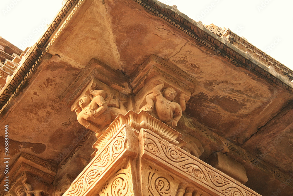 Close up of artful carved walls, Ancient reliefs at famous erotic temple in Khajuraho, Madhya Pradesh, India.