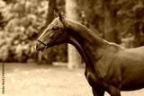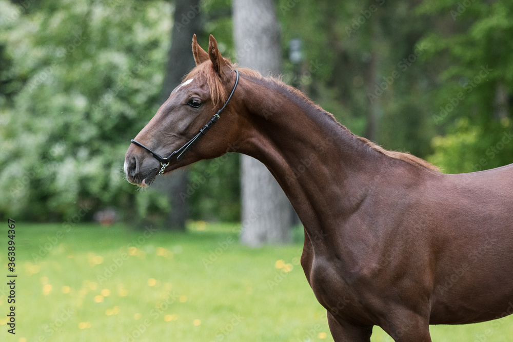 Portrait of a beautiful chestnut horse with mane stands on natural summer background, head closeup