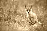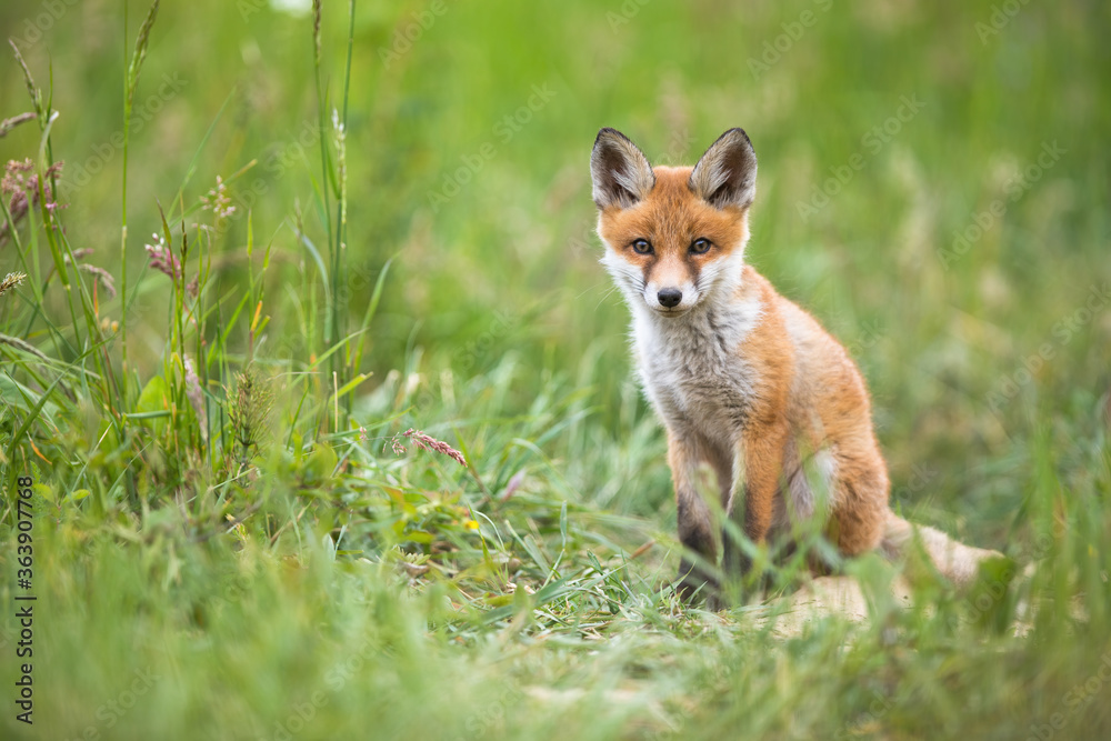 Lovely red fox, vulpes vulpes, cub sitting on meadow in summer nature. Young wild predator with orange fur looking to the camera. Calm animal watching on grassland with copy space,