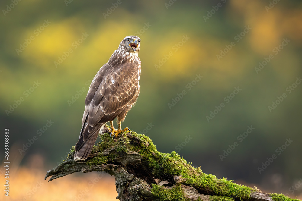 Majestic common buzzard, buteo buteo, sitting on branch in summer. Proud bird of prey screaming on bough in nature. Magnificent feathered animal looking on wood with moss.