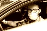 Car driver with protective gloves and a face mask. Everyday prevention against infections and viruses.