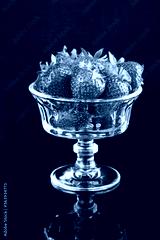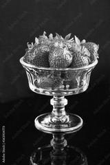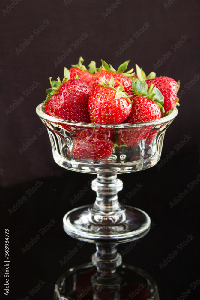 Strawberries in the glass vase on the black background. Location vertical. Closeup.