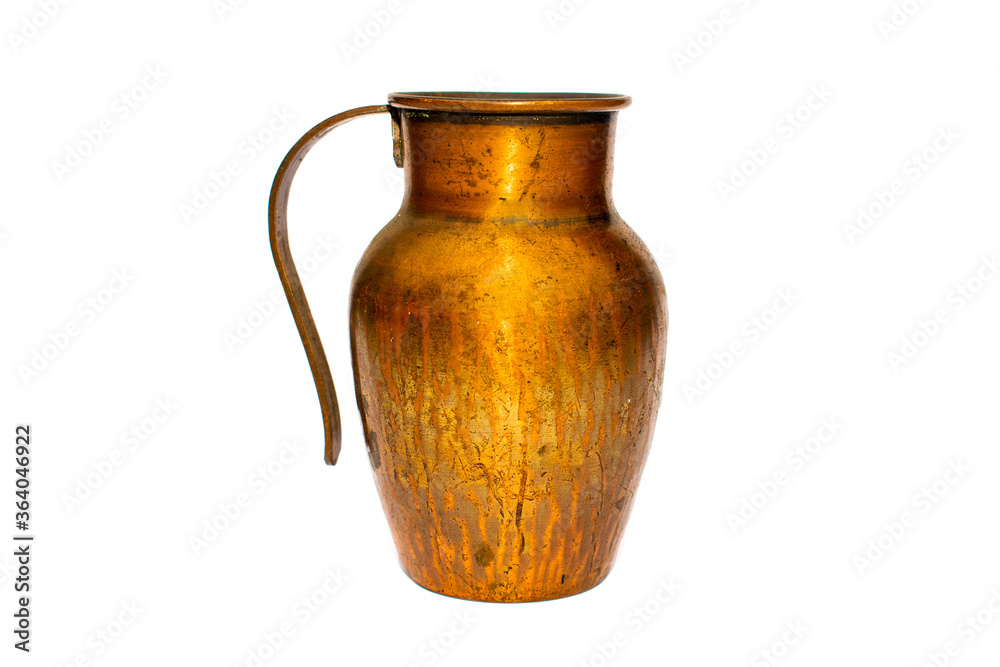 Small gold shiny old copper / bronze jug / pot with handle on a white studio background