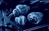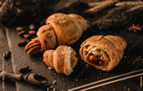Delicious broken croissant with jam on slate background. Pastries and bakery, close up