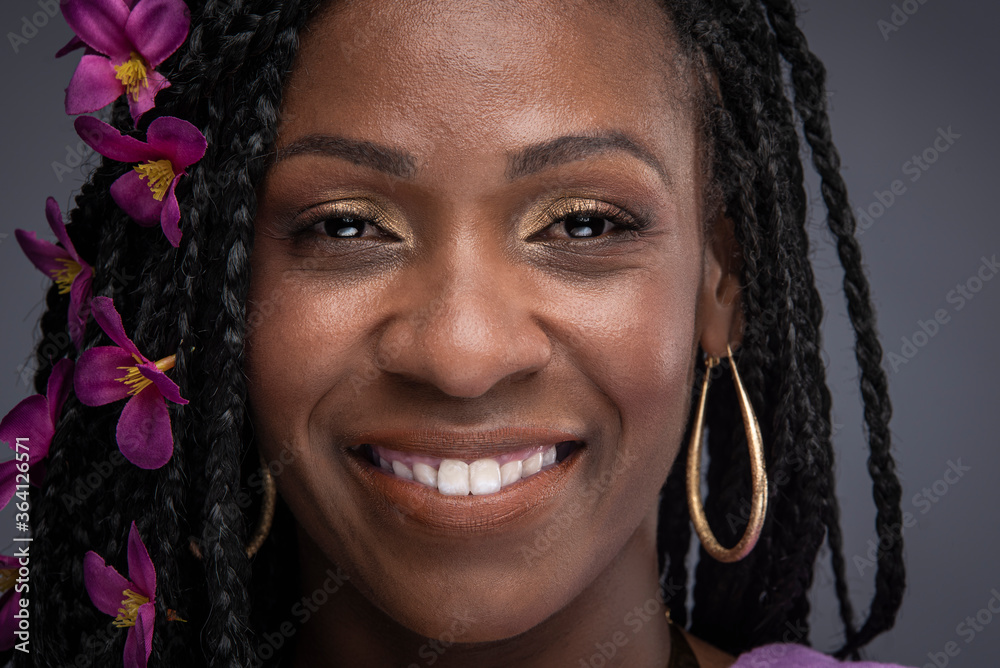 Foto en vertical de una hermosa mujer afroamericana sonriente con flores en su cabello de trenzas