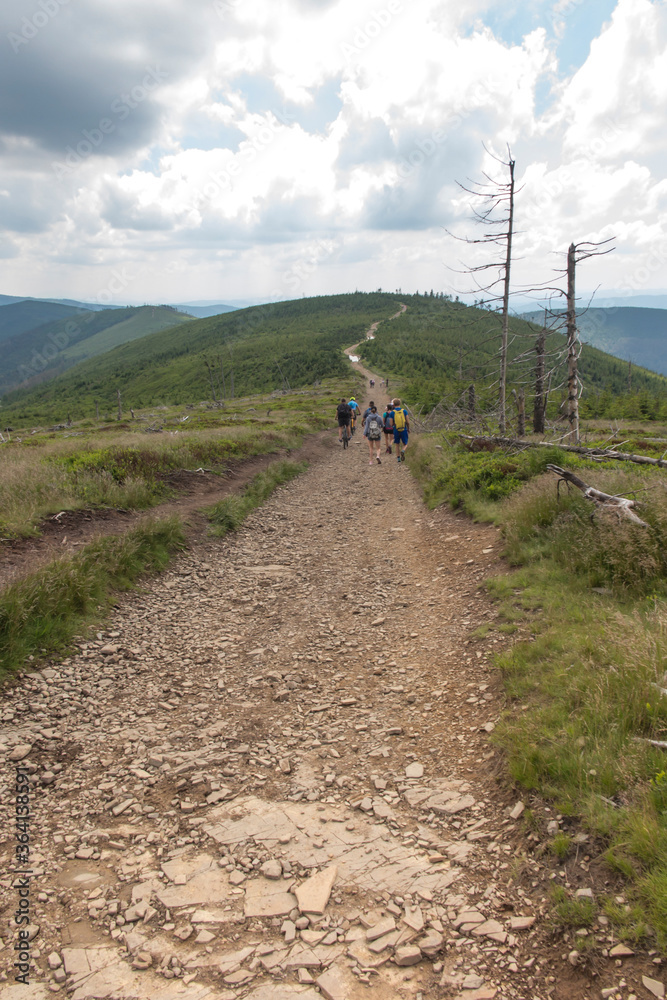 Skrzyczne, Poland, July 04, 2020: Hiking along a mountain trail in the Silesian Beskids near the Skrzyczne peak