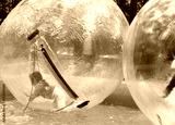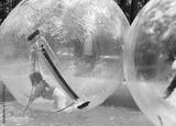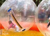 Children play in the pool inside large balls.