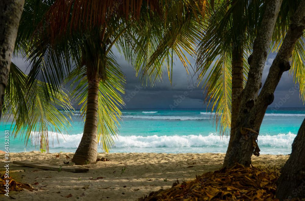 CLOSE UP: Dark stormy skies span above the turquoise ocean washing sandy beach