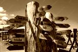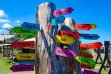 CLOSE UP: Signpost made of an old tree trunk points into different directions
