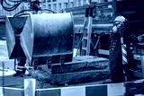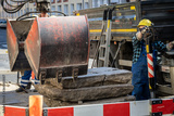 Construction works on the road. Excavator for smaller municipal works, Repair work on pipes and underground lines