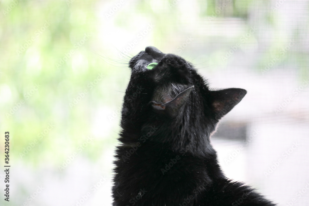 A black cat with green eyes sits by the window and looks up. Selective focus