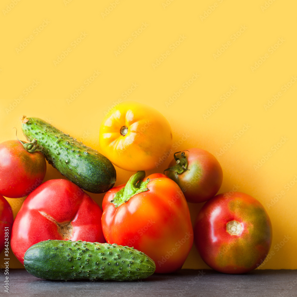 Organic vegetables still life composition. Fresh ripe tomatoes bell pepper and cucumbers on yellow black background. Farmers harvest concept. Copy space