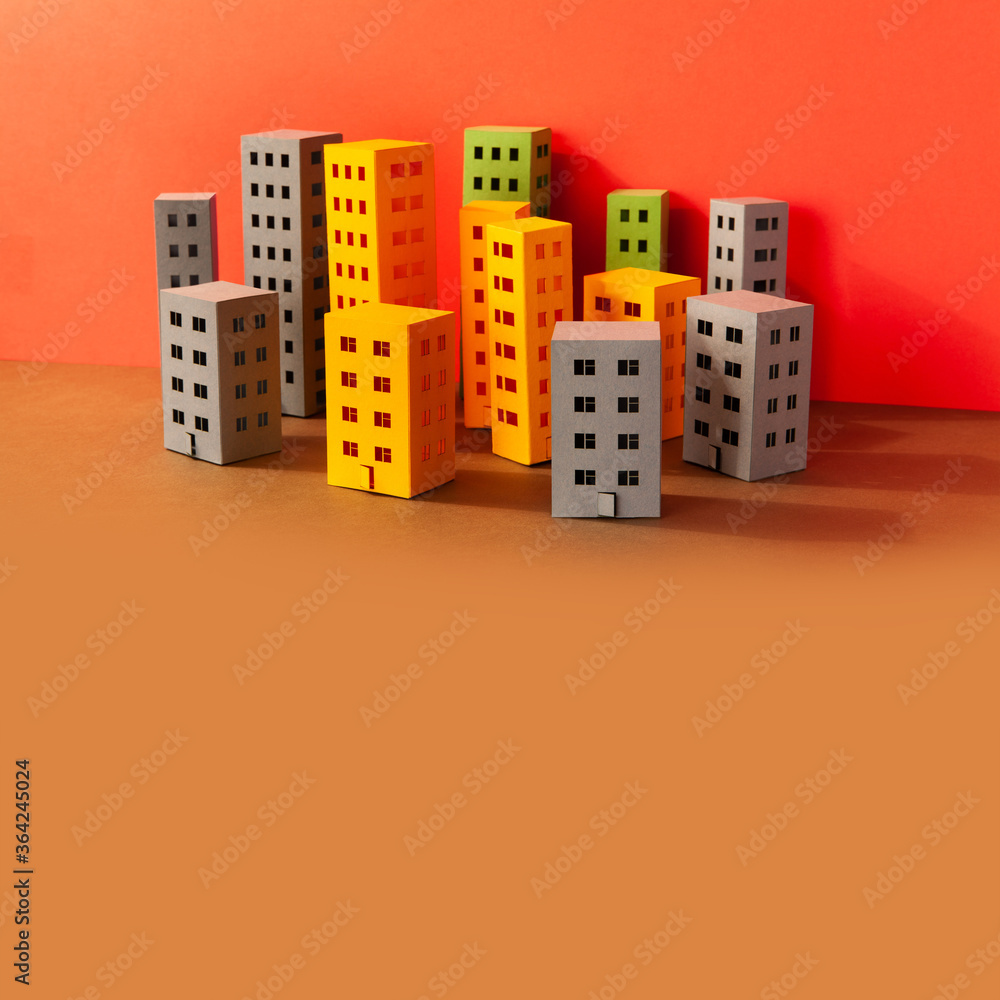 Miniature city multi-colored paper houses on brown background. Abstract urban architecture landscape, simplified town layout with high-rise buildings, skyscrapers many windows. copy space