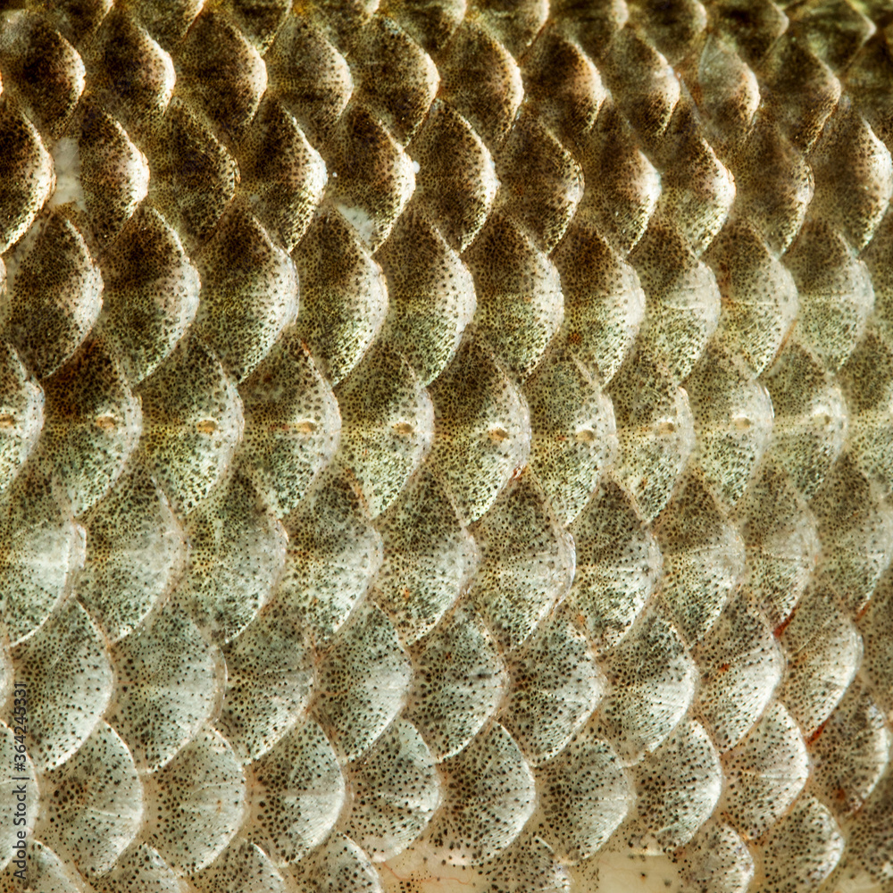 Fish scales skin texture macro view. Geometric pattern photo Crucian carp Carassius scaly with Lateral line. Selective focus, shallow depth field.