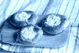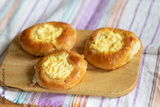 Three fragrant buns stuffed with cheese. Homemade dessert on a wooden cutting board and tablecloth. Shallow depth of field