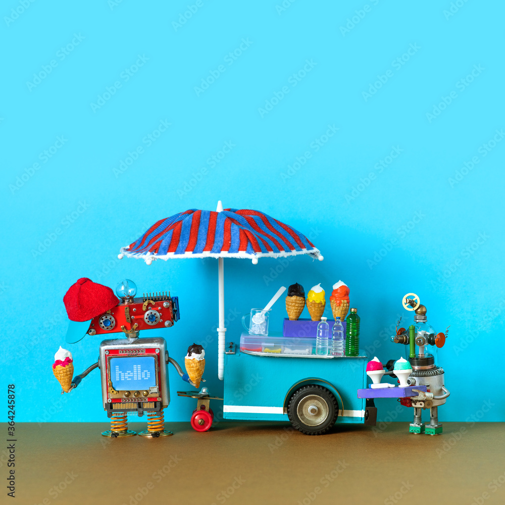 Mobile ice cream cart, miniature toy shop business. The robot seller holds ice cream waffle cones and the second robotic customer carries a tray with a dessert. Blue background, copy space