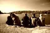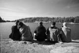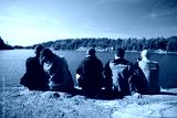 Group of friends standing on rock and enjoying with beautiful view of Baltic sea in Sweden.