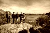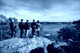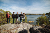 Group of friends standing on rock and enjoying with beautiful view of Baltic sea in Sweden.