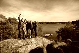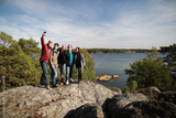 Group of friends standing on the rock and taking selfie picture at Baltic sea background