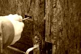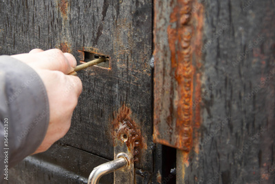 Open the lock on the old metal door with a key.