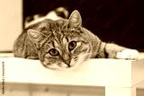 A gray cat is lying on a white table. The cat looks at you with curiosity and interest. Active, attentive animal in the house.