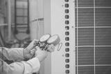 Technician using manifold gauge is measuring equipment for filling industrial factory air conditioners and checking maintenance outdoor air compressor unit.