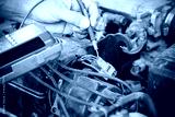 Auto mechanic checking electrical system in a car engine concepts of maintenance repair service and car insurance.